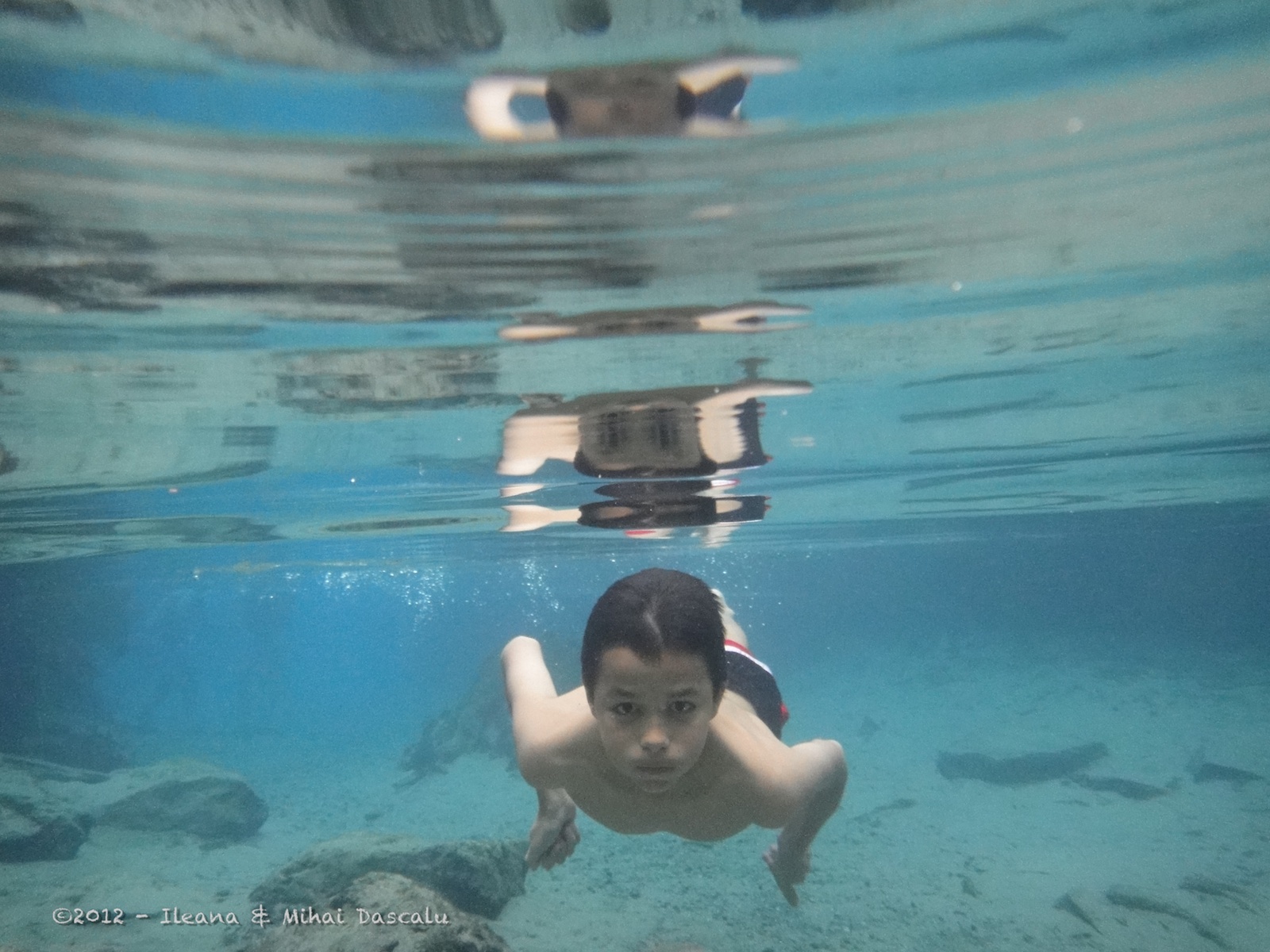 De-abia mai avem răbdare să ne scoatem hainele. Un pas, încă unul, cu grijă să nu alunecăm... apa e moale, o senzație incredibilă, de degete mângâietoare. Ne mișcăm în jurul celor câteva pietre, explorăm marginile, ne admirăm degetele prin apă. E așa de bine aici...